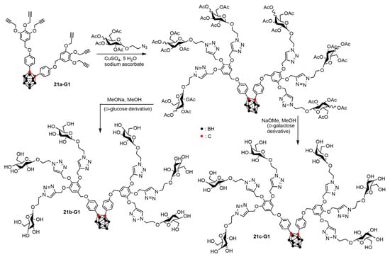 Another series of dendrons having a carborane at the core was synthesized by CuAAC reaction between carborane-cored dendrons bearing three or six alkyne groups (dendron 21a-G1, with six alkyne groups, Scheme 21) and an azide linked to two types of carbohydrates, which are derivatives of protected D-glucose or protected D-galactose. These dendrons were isolated in moderate yields (52–54%). Deprotection of the alcohols with NaOMe in MeOH afforded dendrons functionalized with three (not shown) or six D-glucose (dendron 21b-G1) or six D-galactose moieties (dendron 21c-G1), in good yields (86–93%) (Scheme 21). Only dendrons functionalized with six carbohydrates (21b-G1 and 21c-G1) were fully soluble in water, contrarily with those functionalized with three carbohydrates [].