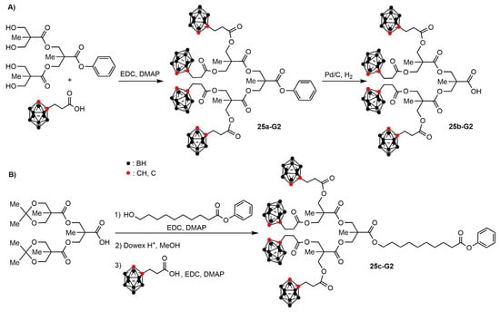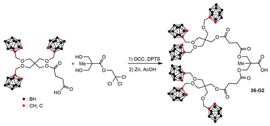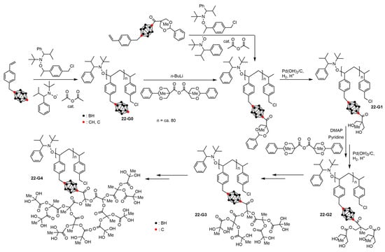 Special types of dendritic structures are the “dendronized polymers”, which are constituted by dendrons grafted to or synthesized on a linear polymer []. Two different approaches were used to obtain dendronized carboranyl polymers, using in both cases para-carboranes. In the first approach, the para-carborane monomer functionalized with a styrene group was polymerized by employing a nitroxide-mediated polymerization (NMP) strategy, using an alkoxyamine initiator, a catalytic amount of free nitroxyde radical and acetic acid in chlorobenzene to afford the polymer 22-G0. In order to synthesize the dendrons stepwise, the polymer was first treated with n-BuLi and then with an excess of benzylidene-protected anhydride of bisMPA shown in Scheme 22. About 70% of the carboranes were functionalized in this way. Finally, removal of the benzylidene protecting groups was carried out using a Pd-catalyzed hydrogenolysis with PdOH2/C/H2, followed by an acid-catalyzed deprotection using H2SO4, to afford the first generation 22-G1. In the second method to obtain polymer 22-G1, the starting compound was a carboranyl monomer already functionalized on one carbon atom with a benzylidene-protecting group, and on the other carbon atom with a styrene group. Polymerization using the NMP strategy obtaining the same type of polymer and subsequent deprotection were carried out as indicated above. This approach yields the dendronized polymer 22-G1 that contains 100% functionalized carboranes, as opposed to the previous method yield of 70%. Polymer 22-G1 obtained by both methods was reacted successively in an iterative esterification with the benzylidene-protected anhydride of bisMPA, DMAP (4-dimethylaminopyridine) and pyridine. The second step was the deprotection of the anhydride, as illustrated in Scheme 22. In both cases, the synthesis was carried out up to the fourth generation of the dendrons, i.e., up to the dendronized polymer 22-G4 [].