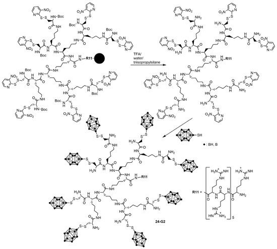 Another type of peptide dendron functionalized with boron clusters on the surface was first obtained by growing different layers of peptides in the solid phase starting from R11, a cell-penetrating peptide composed of 11 arginine residues, linked to a resin. Prior to the reaction of the surface layer with a Boc-protected cysteine (Boc: tert-butyloxycarbonyl), three layers of lysine were constructed. Full deprotection of cysteine enabled also the cleavage of the dendron from the resin. Finally, eight mercaptoundecahydro-dodecaborate units were grafted on the surface, as illustrated in Scheme 23, to afford dendron 24-G2 isolated in 37% yield [].