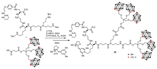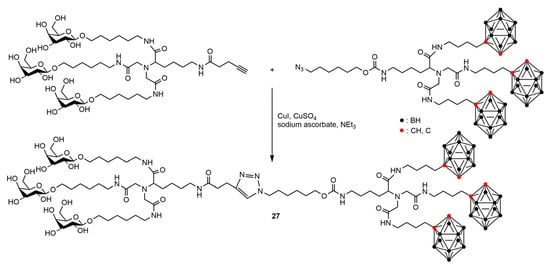 The small Janus dendrimer 27 (Scheme 26) was used to treat HepG2 cells (human liver cancer cell line) by irradiation with thermal neutrons. In these conditions, the cell killing efficiency of dendrimer 27 was 10-fold greater than that of the monomeric BSH (sodium borocaptate, Na2B12H11SH) [].