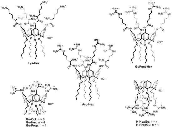 - Bagnacani, V.; Franceschi, V.; Fantuzzi, L.; Casnati, A.; Donofrio, G.; Sansone, F.; Ungaro, R. Lower Rim Guanidinocalix[4]arenes: Macrocyclic Nonviral Vectors for Cell Transfection. Bioconjugate Chem. 2012, 23, 993–1002. [Google Scholar] [CrossRef]