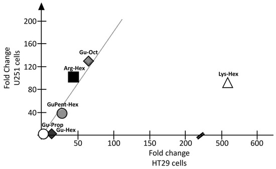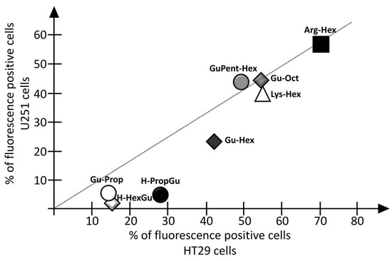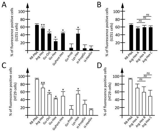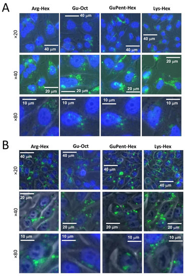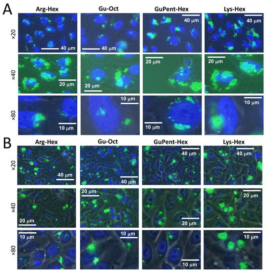 - Fuchs, S.M.; Raines, R.T. Pathway for Polyarginine Entry into Mammalian Cells. Biochemistry 2004, 43, 2438–2444. [Google Scholar] [CrossRef]