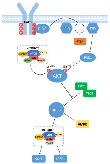 Epidermal Growth Factor Receptor (EGFR) is a cell surface receptor that belongs to the ErbB family of receptor tyrosine kinases. EGFR is activated by binding specific ligands, such as the epidermal growth factor (EGF) or transforming growth factor-alpha (TGF-α). Ligand binding induces receptor dimerization, leading to the activation of the intrinsic kinase activity of EGFR. The catalytic domain of EGFR kinases carries out a transphosphorylation process by which an array of tyrosine residues at the c-terminal cytoplasmic domain of EGFR are phosphorylated by its dimerized partner. Phosphotyrosine (pY) at the cytoplasmic domain of an activated EGFR acts as a docking site for proteins containing Src homology 2 (SH2) domains, such as Phosphatidylinositol 3-kinase (PI3K). The SH2 domain of PI3K binds to phosphorylated tyrosine residues on EGFR, bringing PI3K in close proximity to the plasma membrane. Upon recruitment, PI3K converts phosphatidylinositol-4,5-disphosphate (PIP2) in the plasma membrane into phosphatidylinositol-3,4,5-trisphosphate (PIP3) [9,10]. This conversion is carried out by the lipid kinase activity of the catalytic subunit of PI3K. The conversion of PIP2 to PIP3 can be antagonized by lipid phosphatase PTEN that converts PIP3 into PIP2 [11]. PIP3 serves as a docking site for proteins containing pleckstrin homology (PH) domains, such as the serine/threonine kinase AKT (also known as protein kinase B). Thus, the presence of PH domains in AKT allows the serine/threonine kinase to be recruited to the plasma membrane where AKT is phosphorylated at two critical residues: Thr308 by phosphoinositide-dependent kinase 1 (PDK1) and Ser473 by the mammalian target of rapamycin complex 2 (mTORC2). These phosphorylation events lead to the full activation of AKT [12]. Fully activated AKT phosphorylates regulates numerous downstream effectors, including proteins involved in cell survival, protein synthesis, metabolism, and cell-cycle progression. One of the key targets of activated AKT is the mammalian target of rapamycin (mTOR), which exists in two complexes: mTORC1 and mTORC2 (Figure 1).