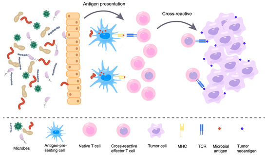 Although these studies have confirmed that microbial molecular mimicry can inhibit tumor growth through T-cell cross-reactivity, there is still a lack of evidence and studies on whether their presence is universal and whether they have an effective stimulation effect on T cells. It has been shown that tumors are flooded with anti-microbial T cells, such as tumor-infiltrating cytotoxic T lymphocytes (TIL). Moreover, CD8+ TILs present in human lung and colorectal cancer are not only specific for tumor antigens but also recognize viral epitopes [96]. Researchers used bioinformatics techniques to compare tumor antigen libraries with intestinal bacteria and viral sequences and found substantial sequence homology between them [85,89]. Furthermore, some investigators have identified peptides from intracellular bacteria in melanoma tumors with the help of HLA peptidomics and 16S rRNA sequencing. They demonstrate that the bacteria that colonize melanoma tumors can enter melanoma cells and that their peptides can be presented on the surface of tumor cells [97]. In a recent study, researchers injected persistently infected cytomegalovirus mouse (MCMV)-derived T cell epitopes into tumors. They found that CMV-specific T-cell responses could be redirected into tumors to stimulate anti-tumor immune responses [98]. It is suggested that viral-derived peptide epitopes can effectively activate anti-tumor T-cell responses.