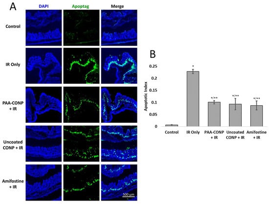 A fluorescent terminal deoxynucleotidyl transferase dUTP nick end labeling (TUNEL) assay (ApopTag Fluorescein In Situ Apoptosis Detection Kit, MilliporeSigma, Burlington, MA, USA) was used to measure apoptosis in mouse colon tissue. Mice were separated into groups of control, irradiation only (n = 3), PAA-CONP pre-treatment plus irradiation (n = 6), and uncoated CONP pre-treatment plus irradiation (n = 3). Amifostine pre-treated animals were also irradiated to compare CONPs to an established radioprotective drug (n = 3). Following SARRP irradiation of the mouse colons, all mice were sacrificed at 4 h based on prior research showing this time point has maximally evident apoptosis in mouse colons [59]. The mouse colons were then excised and frozen in an optimal cutting temperature (OCT) compound as a “swiss roll”, as previously described [60]. Colon cryosections were created at 6 μm on a cryostat (Leica Biosystems, Deer Park, IL, USA), placed on a microscope slide, and preserved at −20 °C until staining. The slides were stained using the ApopTag assay and counterstained with DAPI (MilliporeSigma, Burlington, MA, USA) for nuclear staining in Vectashield mounting media (Vector Laboratories, Inc., Newark, CA, USA). Analysis of colon slides was completed in ImageJ 1.54d (NIH, Rockville, MD, USA) by using threshold quantification of staining area after artifact removal. The ratio of apoptosis staining to nuclear staining was used to determine the apoptotic index.