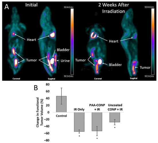Changes in the volume of spontaneous colon tumors over the course of 2 weeks were calculated based on [18F]FDG PET imaging of untreated control mice, irradiated mice, and mice pre-treated with PAA-CONP and uncoated CONP prior to irradiation. Figure 2 shows that irradiation caused significant tumor regression in all animals compared to control (p < 0.05). Tumor volume changes were not statistically significant between irradiated mice versus either of the CONP treatments, though uncoated CONPs showed a trend toward poorer tumor control (p = 0.07 vs. irradiation alone).