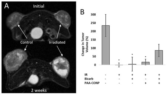 A comparison of the change in tumor volume of HCT-116 xenograft tumors, measured by MRI, between untreated control, and several irradiation conditions is presented in Figure 4. Irradiation caused decreased growth in all groups, though this was statistically significant only for tumors treated with irradiation alone and those pre-treated with sodium bicarbonate alone or PAA-CONP alone followed by irradiation (p < 0.05). When combined, sodium bicarbonate treatment followed by PAA-CONP treatment and then irradiation showed a trend toward increased tumor growth compared to the other irradiation groups, though this was not statistically significant.
