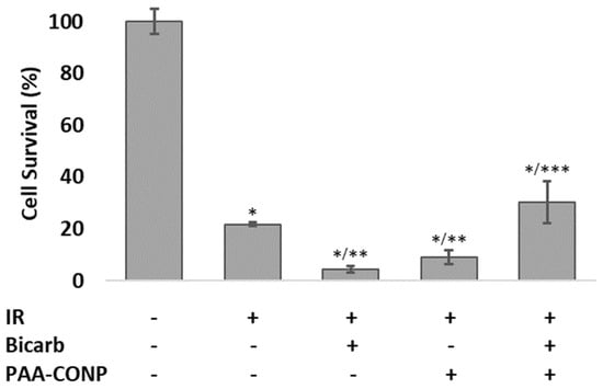 Effects of PAA-CONP and bicarbonate administration on the cell survival of irradiated xenograft HCT-116 tumors. Irradiated tumors showed significantly decreased cell survival compared to controls. Tumors from mice treated with PAA-CONP or bicarbonate before irradiation showed a further decrease in cell survival compared to tumors that were only irradiated. When treated with both bicarbonate and PAA-CONP, tumors showed an increase in cell survival compared to irradiated tumors treated with either alone. (Mean ± SEM, n = 3, * p < 0.0005 vs. Control, ** p < 0.05 vs. IR Only, *** p < 0.05 vs. IR + Bicarb and IR + PAA-CONP).