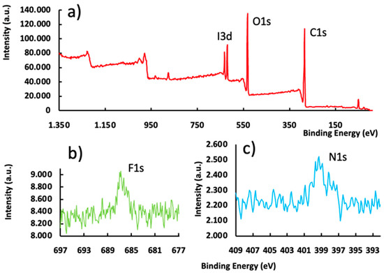 We analyzed our voriconazole particles further with XPS. This enabled identification and quantification of all elements (except hydrogen) present at the surface (depth 1–10 nm). The full XPS spectrum of our pristine microspheres is shown in Figure 3a. The expected XPS peaks (I3d, O1s and C1s) were observed. Figure 3b,c is discussed below.