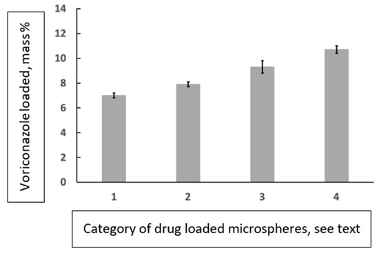 Histogram showing the drug loading (spectrophotometric determinations) of several microparticle/drug combinations studied; the vertical axis shows the drug-loading percentages, i.e., [drug loading (mg)/mass of the microspheres (mg)] × 100%. The categories (horizontal axis) are defined as follows: 1 = spherical microparticles within diameter range 300–500 μm loaded with voriconazole; 2 = spherical microparticles within diameter range 500–700 μm loaded with voriconazole; 3 = microparticles with a cavity within diameter range 300–500 μm loaded with voriconazole; 4 = microparticles with a cavity within diameter range 500–700 μm loaded with voriconazole.