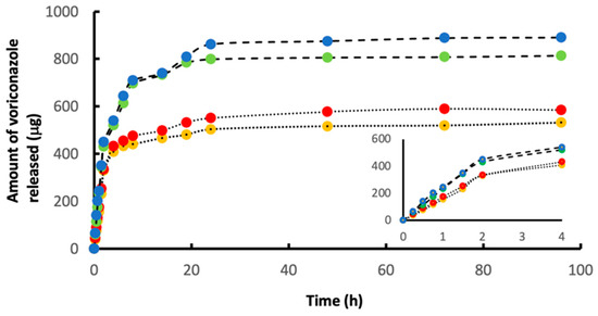 Data from in vitro experiments in which the release of voriconazole from the drug-loaded particles was studied (medium: PBS; temperature: 37 °C). The graphs plot the cumulative drug release versus time. The release curves show a typical initial rise and a plateau. The yellow and red data points refer to the spherical voriconazole-loaded small (300–500 mm) and large (500–700 mm) microspheres, respectively. The green and blue data points correspond to the cavitated voriconazole-loaded small (300–500 mm) and large (500–700 mm) microspheres, respectively. The data show the advantageous effect of the cavities: drug-loading capacity is enhanced by roughly 40%. Further analysis of the data revealed that the presence of the crystalline drug in the cavities also boosts the percentage of the drug that actually gets released (see text). The inserted graph in the lower right part of Figure 8 shows data on the release of voriconazole during the first 4 h in detail. To a good approximation, drug release occurs proportionally with time (zero-order kinetics) during the first 2 h.