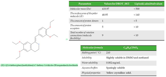 From a structural point of view, drotaverine (1Z)-1-[(3,4-diethoxyphenyl)methylidene]-6,7 diethoxy-3,4-dihydro-2H-isoquinoline (Figure 1) is a benzylisoquinoline derivative, with the molecular formula C24H31NO4 and a molecular weight of 397.5 g/mol (433.97 Da). It is presented in the form of a yellow, odorless powder with a strong bitter taste. The active pharmaceutical ingredient (API) is slightly soluble in water, and the aqueous solution has an acidic reaction with a pKa of 7.11 and a logP of 5.35. In therapy, it is used in the form of drotaverine hydrochloride, a salt obtained with chlorohydric acid [2,15,16]. Respecting the Lipinski Rule of Five, the structural and molecular data have to be less than the values stipulated in Figure 1. The API can be administrated orally, intravenously, or intramuscularly, and the method of administration not generating a significant change in pharmacological parameters (half-life, clearance, apparent distribution volume).