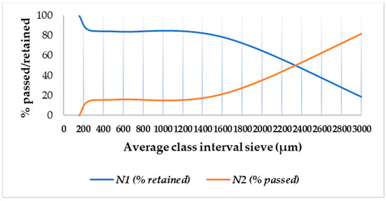 The particle size distribution was achieved by sifting the obtained DROT-FDGs for 10 min using a pre-established set of sieves arranged in descending order considering the mesh size of the sieve (4000, 2500, 800, 315, 200, and 160 µm). For each range, the average mesh was calculated as the dimension of the previous mesh with the mesh where the granules did not trespass divided by two, as in Table 5 [33]. The amount of granules that remained on each sieve was weighed using a four-decimal scale (Kern, Kern, Germany), and the average particle size was determined altogether with the granulometric curve.