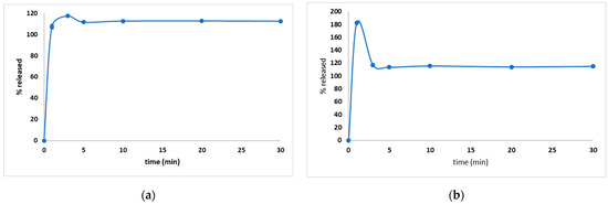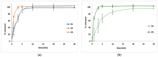 The dissolution behavior is outlined in Figure 13, and this parameter highlights that in the case of all five formulations, over 95% of API was released after 30 min. In the case of D2 and D5, over 95% were released after 3 min, a fact that suggests a high dissolution rate.