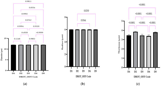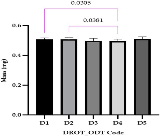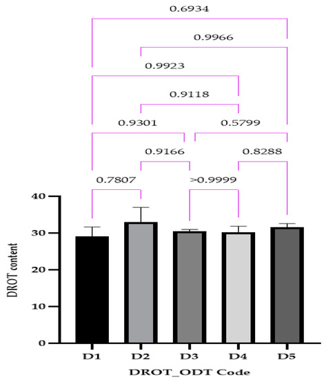 DROT-ODTs content expressed as average ± SD of the developed DROT-ODTs Brown–Forsythe and Welch ANOVA test (multiple comparisons); significance level (p < 0.05). D1 (1% EMCS), D2 (5% EMCS), D3 (1% SSP), D4 (5% SSP), and D5 (3% EMCS). All unmarked comparisons correspond to nonsignificant differences (p > 0.05).