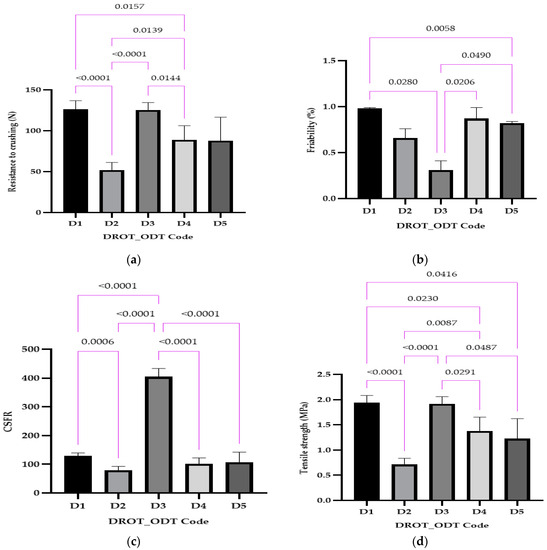 DROT-ODTs resistance to crushing (a), friability (b), crushing strength-friability ratio (c), and tensile strength (d) expressed as average ± SD of the developed DROT-ODTs Brown–Forsythe and Welch ANOVA test (multiple comparisons); significance level (p < 0.05). D1 (1% EMCS), D2 (5% EMCS), D3 (1% SSP), D4 (5% SSP), and D5 (3% EMCS). All unmarked comparisons correspond to nonsignificant differences (p > 0.05).