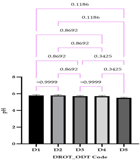 DROT-ODTs pH expressed as average ± SD of the developed DROT-ODTs Brown–Forsythe and Welch ANOVA test (multiple comparisons); significance level (p < 0.05). D1 (1% EMCS), D2 (5% EMCS), D3 (1% SSP), D4 (5% SSP), and D5 (3% EMCS).