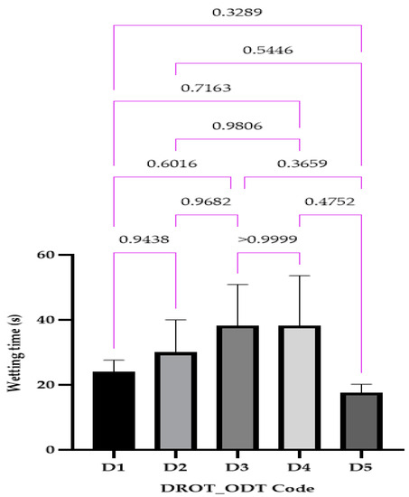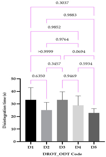 DROT-ODTs wetting time expressed as average ± SD of the developed DROT-ODTs Brown–Forsythe and Welch ANOVA test (multiple comparisons); significance level (p < 0.05). D1 (1% EMCS), D2 (5% EMCS), D3 (1% SSP), D4 (5% SSP), and D5 (3% EMCS). All unmarked comparisons correspond to nonsignificant differences (p > 0.05).