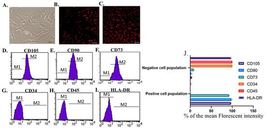 Following informed written consents, twenty milk samples were collected from donor mothers under septic conditions from Zagazig University’s pediatric hospital. The volume of each collected breast milk sample from each mother was 15–20 mL. Breast milk mesenchymal stem cells were isolated according to the method developed by Patki et al. [33] and reported by [34,35]. After the third passage, the cells were identified with flow cytometrical analysis of positive surface markers (CD105, CD90, and CD73) using CD90FITC, CD73PE, and CD105 FITC antibodies (Minneapolis, MN, USA) and negative markers (CD34, CD45, and HLA-DR) using CD34PE, CD45FITC, and HLA-DRPE antibodies (Minneapolis, MN, USA). The Br-MSCs were labeled with PKH-26 (Sigma Aldrich, St. Louis, MO, USA) following the manufacturer’s instructions for tracking the transplanted cells [33,34].