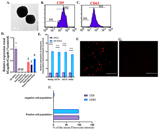 Identification and homing of Br-MSCs and exosomes and expression of the embryonic transcriptional factor of Br-MSCs (A–F). (A) TEM photomicrograph of exosomes; (B) flow cytometry of CD9 positive exosomes; (C) flow cytometry of CD63 positive exosomes; (D) detection of Br-MSCs, exosomes, Br-MSCs + EXOs in rat renal tissue at the end of the experiment via relative expression of human Gapdh mRNA at the end of the experiment after 12 weeks; (E) expression of Br-MSCs embryonic transcriptional factors (Nanog, OCT3/4, Sox2) compared with human mononuclear cell layer (MNC); (F) homing of exosomes in renal tissue of EXOs rats group 3rd day post-transplantation assayed by PKH-26, Scale bar 400 µm,; (G) % of the mean fluorescent intensity for positive and negative cell population for CD9 and CD63, Scale bar 400 µm, (H) representative photomicrograph for renal tissue of Nephro + CM group under florescent microscope showing negative florescent signal; *** p < 0.001, @,#,$,* Means bearing different superscripts were significantly different at p < 0.05.