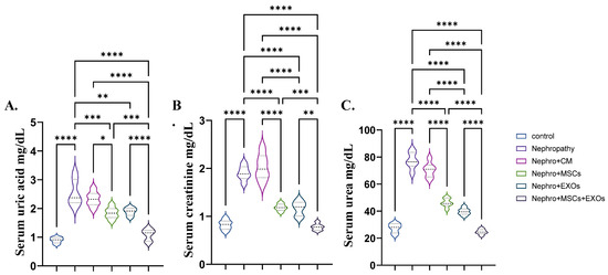 Effect of Br-MSCs and/or their derived EXOs on renal function tests (A–C). (A) Serum uric acid mg/dL, (B) serum creatinine mg/dL, and (C) serum urea mg/dL. Values are the mean of 6–8 rats per group ± S.E.M. * p < 0.05, ** p < 0.01, *** p < 0.001, **** p < 0.0001.