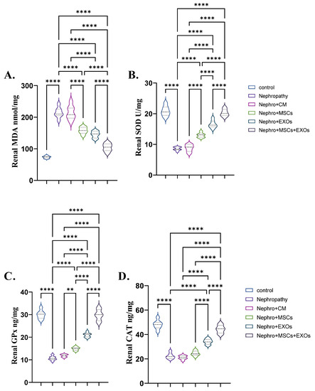 Effect of Br-MSCs and/or their derived EXOs on renal oxidant/antioxidant markers (A–D). (A) renal MDA (nmol/mg), (B) renal SOD (U/mg), and (C,D) renal CAT (ng/mg). Values are the mean of (n) 6–8 rats per group ± S.E.M. ** p < 0.01, **** p < 0.0001.
