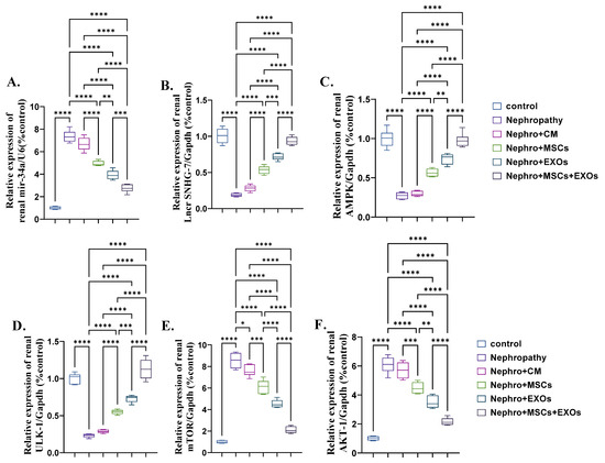 There was significant (p < 0.001) upregulation in the mean fold change for the relative expression of mir-34a, mTOR, and AKT and downregulation in the mean fold change for the relative expression of SNHG-7, AMPK, and ULK-1 in the nephropathy and CM-treated rats compared with control ones (Figure 5A–F). In contrast, Br-MSCs + EXO, EXOs, and Br-MSCs’ transplantation caused a significant (p < 0.001) downstream regulation of mir-34a, mTOR, and AKT expression, and upstream regulation in SNHG-7, AMPK, and ULK-1 expression, respectively, compared with nephropathy and CM-treated groups (Figure 5A–F).
