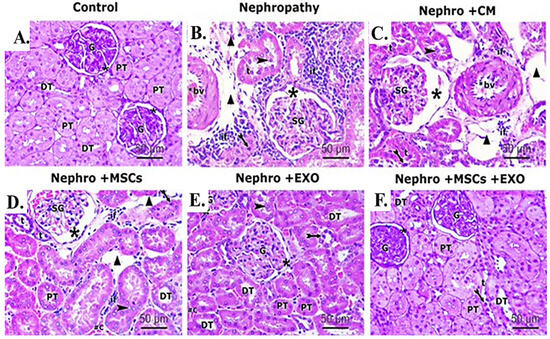 Effect of Br-MSCs and/or their derived EXOs on the renal histopathological changes (A–F). (A) Photomicrographs of H&E-stained sections showing histological features of control group, showing a spherical renal corpuscle lined by Bowman’s capsule, the glomerulus (G) appears as a large cellular mass surrounded by narrow Bowman’s space (star). Proximal convoluted tubules (PT) have a narrow star-shaped lumen and are lined by acidophilic cuboidal cells with an apical brush border. The distal convoluted tubules (DT) have a wider lumen and are lined by more cells. (B) Photomicrographs of H&E-stained sections showing histological features of the nephropathy group showing marked distorted cortical structures and features of tubule degeneration. The lining epithelium of some tubules (t) is sloughed into their lumina (arrowhead). Other tubules showed vacuolation of the lining epithelium with pyknotic nuclei (bifid arrow). Shrunken glomeruli (SG), wide Bowman’s space (star), and wide spaces between tubules (triangle) are seen. Heavy inflammatory cell infiltration (if) and thick-walled blood vessels (bv) can be noticed between the tubules. (C) Photomicrographs of H&E-stained sections showing histological features of nephropathy+ CM group, showing nearly similar histological findings as in nephropathy group in the form of exfoliated tubular cells (arrowhead), pyknotic nuclei (bifid arrow), shrunken glomeruli (SG), and wide Bowman’s space (star). Also, foci of inflammatory cell infiltration (if), wide spaces (triangle) between the tubules (t), and thick-walled blood vessel (bv) can be noticed. (D) Photomicrographs of H&E-stained sections showing histological features of nephropathy + MSCs group showing some normal cortical tubules having wide lumina (DT) and star-shaped lumina (PT). However, the lining epithelium of affected tubules showed pyknotic nuclei (bifid arrow) and the lumina of some tubules (t) showed exfoliated epithelium (arrowhead). Shrunken glomeruli (SG), wide Bowman’s space (star), wide spaces between tubules (triangle), and inflammatory cell infiltration (if) can be seen in the interstitium. (E) Photomicrographs of H&E stained sections showing histological features of nephropathy + EXOs group showing marked restoration of normal cortical tubules architectures that appeared with wide lumina (DT), star-shaped lumina (PT), and normal glomerular structure (G), surrounded by narrow Bowman’s space (star). However, the lining epithelium of few affected tubules showed dark nuclei (bifid arrow). (F) Photomicrographs of H&E-stained sections showing histological features of nephropathy + MSCs + EXOs group, showing a histological profile comparable to the control group in the form of normal glomerular structure (G), surrounded by narrow Bowman’s space (star). Proximal convoluted tubules (PT) lined by tubular cells have a star-shaped lumen and vesicular nuclei. Distal convoluted tubules (DT) have wider lumen. Only a few distal tubules (t) showed dark nuclei (bifid arrow) (H&EX 400, Scale bar = 50 μm). n = 5–6 rats per group.