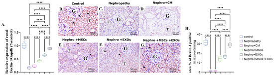 Effect of Br-MSCs and/or their derived EXOs on renal Beclin-1 mRNA and protein expression (A–H). (A) Relative expression of Beclin-1/Gapdh (% control); (B) photomicrographs of anti-Beclin immune-stained sections of the renal cortical structures in control group showed moderate positive brown cytoplasmic immunostaining (arrow head) in the epithelial cells of the renal tubules (T) and glomerular endothelial cells (G); (C,D) photomicrographs of anti-Beclin immune-stained sections of the renal cortical structures in nephropathy and nephropathy + CM groups showed marked reduction in cytoplasmic immunoreactivity in the epithelial cells of the renal tubules (T) and glomerular cells (G); (E,F) photomicrographs of anti-Beclin immune-stained sections of the renal cortical structures in nephropathy + MSCs and nephropathy + EXOs groups showed marked increase in the immune reaction (arrow head) in the renal tubular cells (T) and the glomerular cells (G); (G) photomicrographs of anti-Beclin immune-stained sections of the renal cortical structures in nephropathy + MSCs + EXOs group showed strong immune reaction similar to that of control group (arrow head) in the epithelial cells of the renal tubules (T) and the glomerular cells (G); (H) area % of Beclin-1 positive immunostaining. Values are the mean of (n) 6–8 rats per group ± S.E.M. **** p < 0.0001. (Beclin immunoperoxidase stain counterstained with H.; X400, Scale bar = 50 μm).