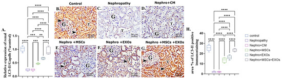 The nephropathy and CM-treated group revealed a significant (p < 0.001) downregulation in both mRNA and protein expression of renal LC3-II compared with the control group (Figure 8A–D,H). On the opposite side, Br-MSCs + EXO, EXOs, and Br-MSCs’ transplantation induced a significant upregulation in the mean value of gene and protein expression of renal LC3-II compared with the nephropathy and CM-treated groups correspondingly (Figure 8A,E–H).
