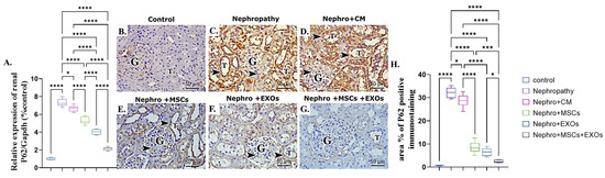 Effect of Br-MSCs and/or their derived EXOs on renal LC3-II mRNA and protein expression (A–H). (A) Relative expression of Beclin-1/Gapdh (% control), (B) photomicrographs of anti-LC3 immune-stained sections of the renal cortical structures in control group showed strong positive brown cytoplasmic immunostaining (arrow head) in the epithelial cells of the renal tubules (T) and glomerular endothelial cells (G), (C,D) photomicrographs of anti-LC3 immune-stained sections of the renal cortical structures in nephropathy and nephropathy + CM groups showed marked reduction in cytoplasmic immunoreactivity in the epithelial cells of the renal tubules (T) and glomerular cells (G), (E,F) photomicrographs of anti-LC3 immune-stained sections of the renal cortical structures in nephropathy + MSCs and nephropathy + EXOs groups showed marked increase in the immune reaction (arrow head) in the renal tubular cells (T) and the glomerular cells (G), (G) photomicrographs of anti-LC3 immune-stained sections of the renal cortical structures in nephropathy + MSCs + EXOs group showed strong immune reaction similar to that of control group (arrow head) in the epithelial cells of the renal tubules (T) and the glomerular cells (G), and (H) area % of LC3-II positive immunostaining. Values are the mean of (n) 6–8 rats per group ± S.E.M. ** p < 0.01, *** p < 0.001 **** p < 0.0001. (LC3 immunoperoxidase stain counterstained with H.; X400, Scale bar = 50 μm.)