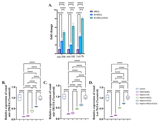 Both Br-MSCs and EXOs expressed the antifibrotic microRNAs, mir-29b, mir-181, and Let-7b; however, the expression level in exosomes was significantly (p < 0.001) higher than Br-MSCs (Figure 10A). Moreover, the nephropathy group showed a significant (p < 0.001) downregulation in the expression of mir-29b, mir-181, and Let-7b compared with the control group. Interestingly, administration of Br-MSCs + EXOs, EXOs, and Br-MSCs significantly (p < 0.001) upregulated the expression of the aforementioned antifibrotic microRNAs in order (Figure 10B–D).