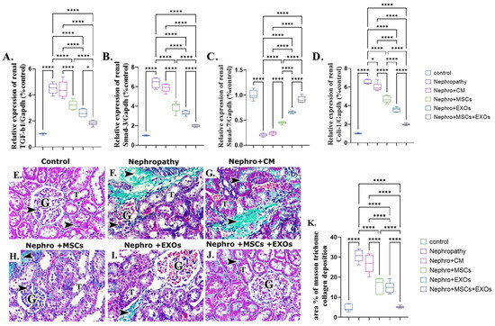 There was a significant (p < 0.001) upregulation in the mean fold change of TGF-β, Smad-3, and coli-1 relative mRNA expression and downregulation in the mean fold change of Smad-7 relative mRNA expression. In addition, there was a more significant increase in the mean area % of collagen deposition of the nephropathy and CM-treated groups than the control one (Figure 11A–G,K). On the contrary, Br-MSCs, EXOs, and Br-MSCs + EXOs’ administration improved the parameters mentioned above significantly (p < 0.001) in rank order of Br-MSCs + EXO, then EXOs followed by Br-MSCs (Figure 11A–D,E–K).