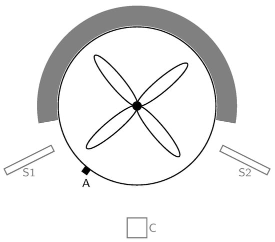 Top view of granulator and sensor setup. A is the position of the acceleration sensor. S1 and S2 are the positions of the shotgun microphones. C is the position of the single condenser microphone. The gray area illustrates the casing of the mixing system.