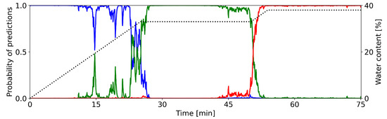 At around 65 min, the network starts having more and more confidence in the prediction of state wet. This prediction then takes over for the remaining time of the granulation process.