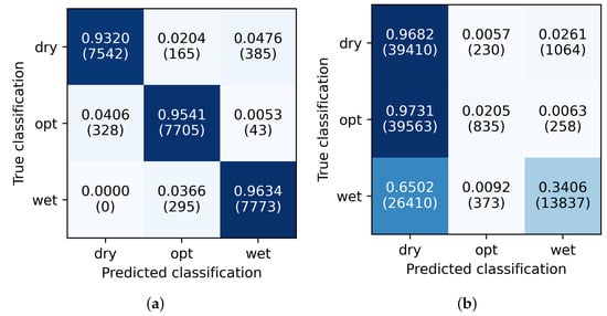 First, the CNNs are able to correctly predict the state dry. Given the true state opt, the CNNs misclassify it as the state dry in more than 97 percent of the cases. The fraction of correct predictions for the state wet is around 35 percent, significantly lower compared to the other training/test setups.