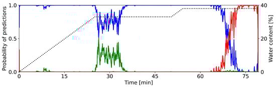 In this section, we want to take a closer look at the classification certainties of the CNNs, i.e., how sure is the CNN when classifying a sample during the granulation process. Figure 3 shows the networks classification outputs of the single condenser microphone data from the multi-day training setup. The colored lines show the probability that the process is in a particular state. Blue, green, and red indicate the states dry, optimal, and wet, respectively. The dotted line shows the water content.