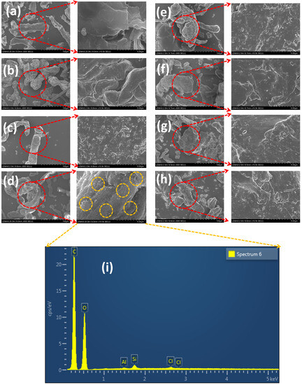SEM photomicrographs of HPMC K100M from different vendors: (a) Methocel CR, (b) Methocel DC, (c) Benecel CR, (d) Benecel DC, (e) Benecel XR, (f) Metolose 90SH, (g) Metolose 90SH SR, and (h) Bonucel. EDX analysis image of (i) Benecel DC.