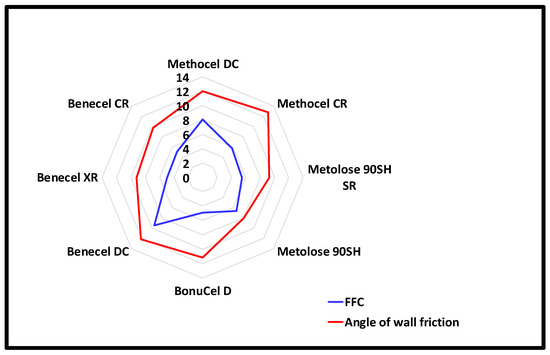The bulk (0.24–0.31 g/cm3), tap (0.36–0.45 g/cm3), and true densities (0.30–0.33 g/cm3) of all the tested polymers were relatively similar. These values were similar to that reported by others [18]. Bonucel had the lowest bulk density (0.24 g/cm3), followed closely by the Methocel DC and CR grades (0.25 g/cm3). Benecel DC had the highest bulk density (0.31 g/cm3). The lowest tapped density was experienced by the Methocel DC grade polymer (0.36 g/cm3), whereas Benecel DC and Metolose 90SH experienced the highest tap density (0.45 g/cm3). Methocel DC and Benecel DC grades had Carr’s index values of 30% for both, demonstrating better flowability than the other tested polymers, which had Carr’s index values ranging from 38–40. Using the ring-shear testing instrument, the HPMC grades showed a relatively similar bulk density, ranging between 0.326 and 0.385 g/cm3) (Figure 2). However, FFC values of these grades were significantly different, with DC grades having higher FFC values in comparison to the other grades. Benecel DC had an FFC value of 9.5, while Methocel DC had an FFC value of 8.05, indicating that Benecel DC has comparatively better flowability than Methocel DC. Methocel CR, Benecel CR, Benecel XR, Metolose 90SH SR, and BonuCel D all had similar FFC values of ~6, indicating that these grades have similar flowability profiles (Figure 3). Metolose 90SH, however, displayed a relatively higher FFC value of 6.65. The angles of wall friction of these grades are presented in Figure 2. The values for the angles of wall friction (9°–13°) obtained suggest that these grades will behave similarly in any interaction with a stainless steel surface.