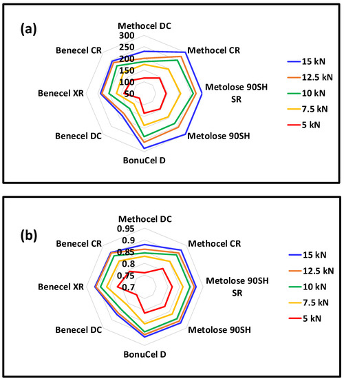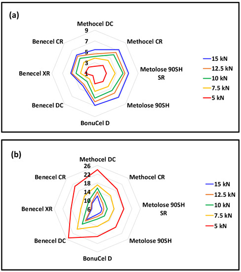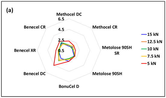 The relationship between compression stress and tensile strength is termed tabletability. It describes the performance of the applied pressure in increasing the tensile strength and the relationship between the compaction pressure and the strength of the tablet [31,32,33]. Figure 4a shows the tabletability profiles of the compacts (5 to 15 kN). The relative tensile strength of all compacts increased with increasing compaction stress. That is because a higher compaction stress led to a longer-lasting plastic deformation of the material particles, thereby sustaining a more significant bonding area between the neighbouring particles [34]. At the same compression stress, Methocel CR grade showed better tabletability than the Methocel DC grade. This was also true for the Benecel grades. Benecel CR and a Benecel XR grades showed better tabletability than Benecel DC grade at all the compression pressures studied. Metolose 90SH SR, however, displayed relatively similar tabletability as the Metolose 90SH grades. Broadly speaking, apart from the Methocel DC and Benecel DC grades, all the other polymers had similar tabletability profiles. The better performance of the CR grade of Methocel relative to the DC grade might relate to the greater population of finer particle fraction in the CR grade of this plastically deforming material, whereby a greater surface area for particle–particle bonding will be available. The poorer tableting performance of the DC grade of Benecel is not related to the relative size of the population of finer particles, as the grades are more or less comparable in this parameter. The less effective tableting may be associated with the co-processing of the polymer with silicon dioxide technology used to prepare Benecel DC, with the silicon dioxide potentially covering some of the sites available for particle–particle bonding and impairing this aspect of compact formation.