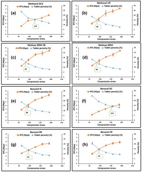 Compaction properties of HPMC powders from different vendors. Relative tensile strength (RTS) (MPa) and porosity (%) relationship with compression stress (MPa) representing the respective tabletability and compressibility profiles at the same compression force (error bars are ±SD) for (a) Methocel DC, (b) Methocel CR, (c) Metlose 90SH SR, (d) Metlose 90SH, (e) BonuCel D, (f) Benecel DC, (g) Benecel XR, and (h) Benecel CR.