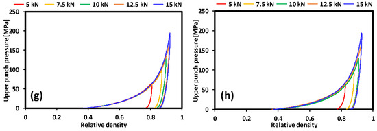 HPMC compaction curves of the polymers from the different vendors showing the relative density at various compaction pressures. (a) Methocel DC, (b) Methocel CR, (c) Metlose 90SH SR, (d) Metlose 90SH, (e) BonuCel D, (f) Benecel DC, (g) Benecel XR, and (h) Benecel CR.
