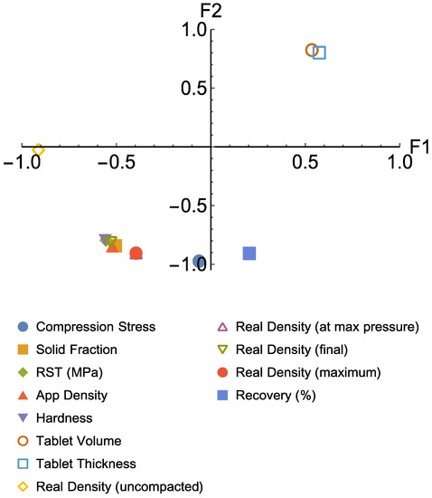 The plot of F2 vs. F1 (Figure 9) indicates the similarity between the material properties if they fall into the same quadrant. As can be seen from Figure 10, tablet volume and tablet thickness are similar, as might be expected. Compression stress and solid fraction, RTS, applied density, hardness, density at maximum pressure, final density, and maximum density are all located in the same quadrant suggesting that they are closely associated. Interestingly, uncompacted density and recovery are distinct, indicating that they are independent properties showing no similarity to any other properties and will therefore require separate measurements. The overall information from Figure 9 suggests that in future experiments, it may not be necessary to measure all the properties listed above; instead, the number of properties measured can be reduced if they fall into the same quadrant. Figure 10 shows the scores of all the material-associated properties for each compaction force on F1 and F2. Here, the materials under certain compaction forces demonstrating similar properties are separated by the groups formed in the four quadrants. For instance, in the top-right quadrant of Figure 11, the oval region contains M14, M41, M42, M43, M44, M51, M52, M61, M62, M63, M64, M72, M74, and M83. This means that the properties for Benecel CR (M1) under 7.5 kN, Methocel CR (M4) under the compaction force from 15 kN to 7.5 kN, Methocel DC (M5) under 15 kN and 12.5 kN, Metolose 90SH (M6) under 15 kN and 12.5 kN, Metolose 90SH SR (M7) under 12.5 kN and 7.5 kN and BonuCel D (M8) under 10 kN showed a strong similarity in results.