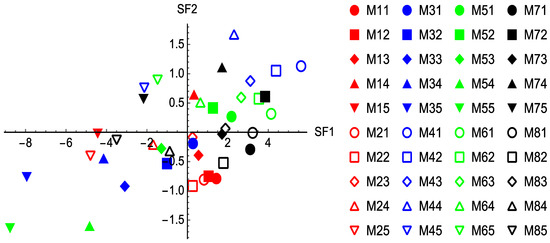 A plot of the scores of all the material-associated properties for each compaction force on F2 vs. that on F1. Note, in the legend, the first number on the right of M indicates the material: 1—Benecel CR, 2—Benecel XR, 3—Benecel DC, 4—Methocel CR, 5—Methocel DC, 6—Metolose 90SH, 7—Metolose 90SH SR, and 8—BonuCel D. The second number on the right of M indicates the compaction force: 1—15 kN, 2—12.5 kN, 3—10 kN, 4—7.5 kN, and 5—5 kN.