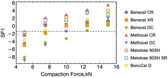 To simplify things further, a plot (Figure 11) for the scores (SF1) on F1 is shown: F1 covers 89.1% variation of the property data. As indicated by the dashed straight line crossing the plot. BonuCel D/Benecel XR, Methocel DC, and Benecel DC have the same score when their corresponding compaction forces are: 7.5 kN, 10 kN, and 12.5 kN, respectively. This means that BonuCel D or Benecel XR under 7.5 kN, Methocel DC under 10 kN and Benecel DC under 12.5 kN will demonstrate similar properties overall. This also suggests that as long as there is a right match between the material properties and the compaction force, some of the HPMC materials studied can be interchangeable.