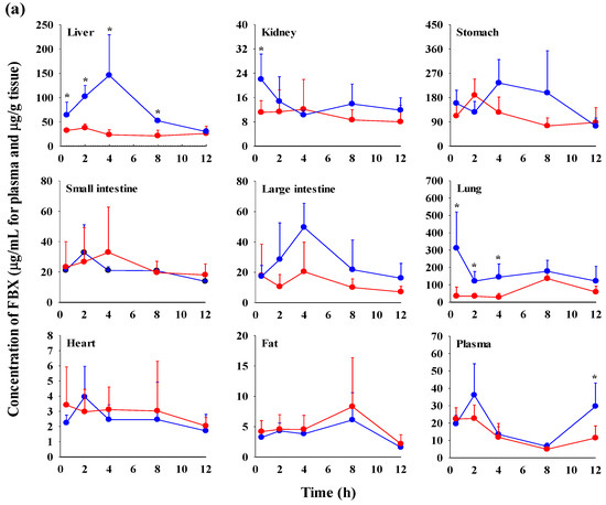 The FBX concentrations in the plasma and various tissues, the ratios of tissue-to-plasma (T/P ratios), and AUC0–720min values at 0.5, 2, 4, 8, and 12 h after the oral administration of FBX or FBX-PG to mice at a dose of 50 mg (10 mL)/kg are shown in Figure 4, Table 3 and Table S1. In FBX-treated mice, FBX was more highly distributed in the lung, stomach, small intestine, and liver than in other tissues (e.g., large intestine, kidneys, heart, and fat). Although differences in distribution depend on the uptake time to tissues and elimination time from tissues, the T/P ratios of FBX in the lung, stomach, liver, small intestine, large intestine, and kidneys were above 1. FBX distribution in the heart and fat was relatively small compared to other tissues because the T/P ratios in the heart and fat were almost below 1. In FBX-PG-treated mice, the tissue distribution patterns of FBX (i.e., FBX concentrations and its T/P ratios) were similar to those in FBX-treated mice. However, the AUC0–720min values of FBX in the lungs and liver were significantly increased (132% and 216% increase, respectively) in FBX-PG-treated mice compared to FBX-treated mice (Table 3).