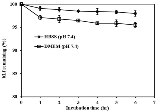 2.5. Stability of bLf in Cell Culture Media (DMEM and HBSS at pH 7.4)