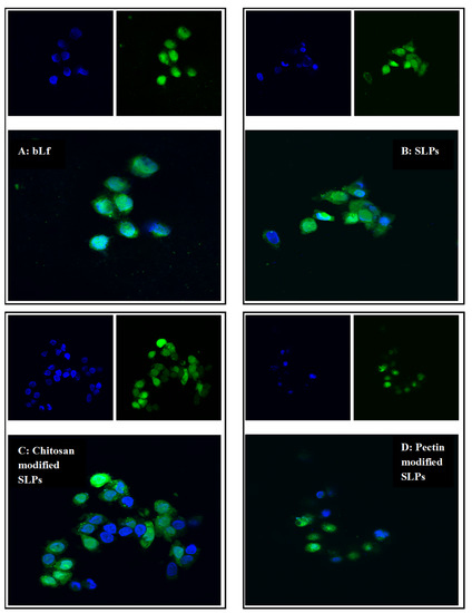 3.4. In Vitro Qualitative and Quantitative Uptake of bLf and bLf-Loaded SLPs