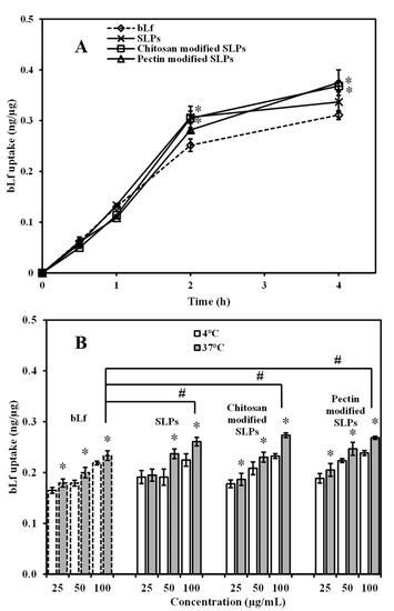 2.6.4. Quantitative Analysis of the Uptake of bLf and bLf-Loaded SLPs