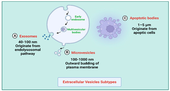 Schematic of EV Subtypes. (A) Exosomes and their formation. (B) Microvesicles and their formation. (C) Apoptotic bodies and their formation. Created with BioRender.com (https://app.biorender.com/illustrations/64d0be423f71706d207a7881, accessed date: 7 August 2023).